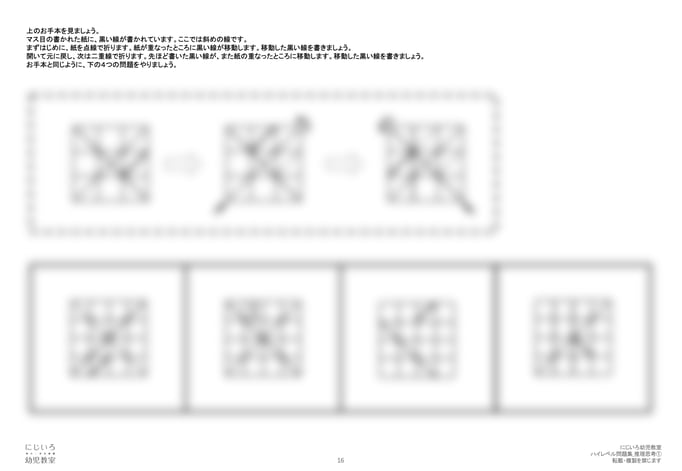 | 問題内容 | 条件付き移動・条件付き重ね・条件付き線対称・線対称と重ねの総合問題・回転推理・カードの移動推理・回転と重ねの総合問題・四方観察の推理・マジックボックス |